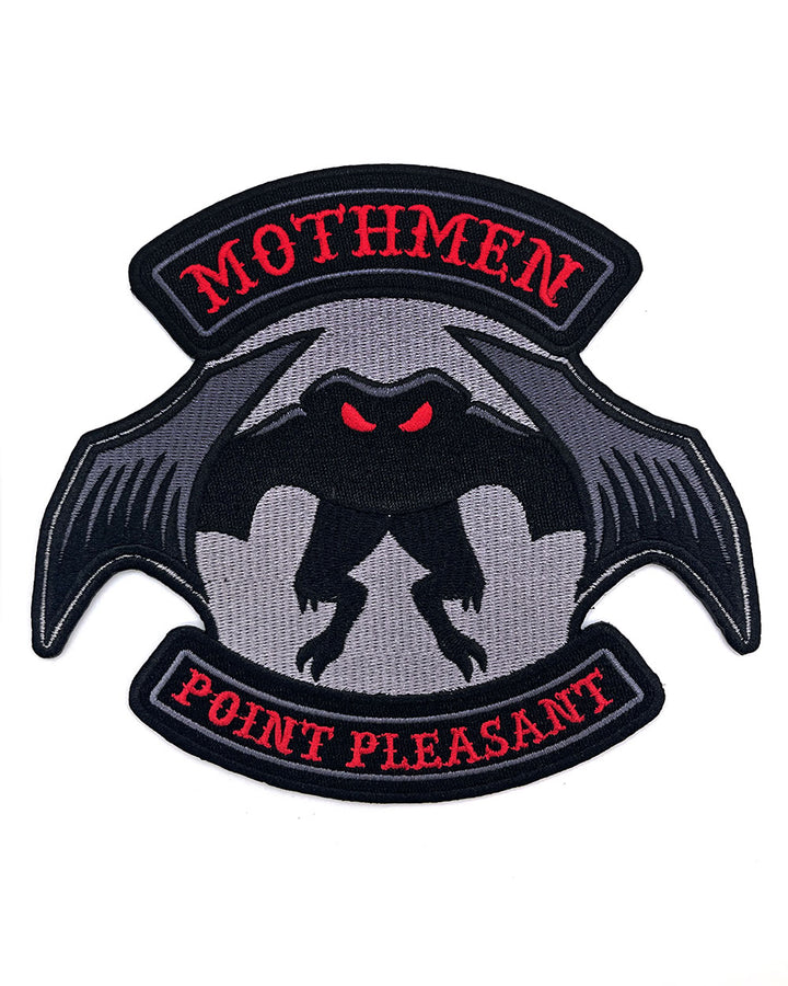 Inspired by motorcycle gangs, this jacket patch features a top rocker and bottom rocker connected by an icon motif. Featuring a fictional Mothman-themed riding club, the Point Pleasant location refers to the West Virginia location surrounding the Mothman sightings.