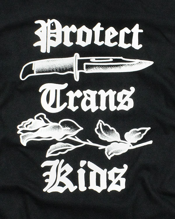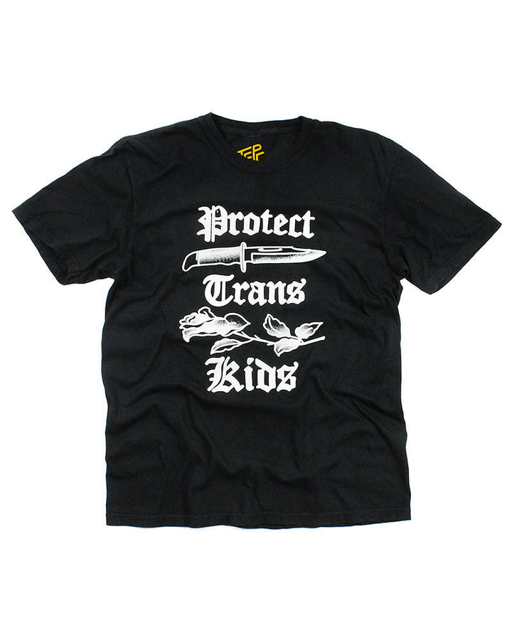 Protect trans kids with love and tenderness, and battle those who oppose them. This declarative protest tee features a knife juxtaposed with a flower.