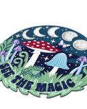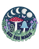 For plant lovers and cottagecore fairies, this back patch is great for your wardrobe. Mushrooms and an all-knowing frog sit amongst the moon phases with a butterfly floating by. Magical!
