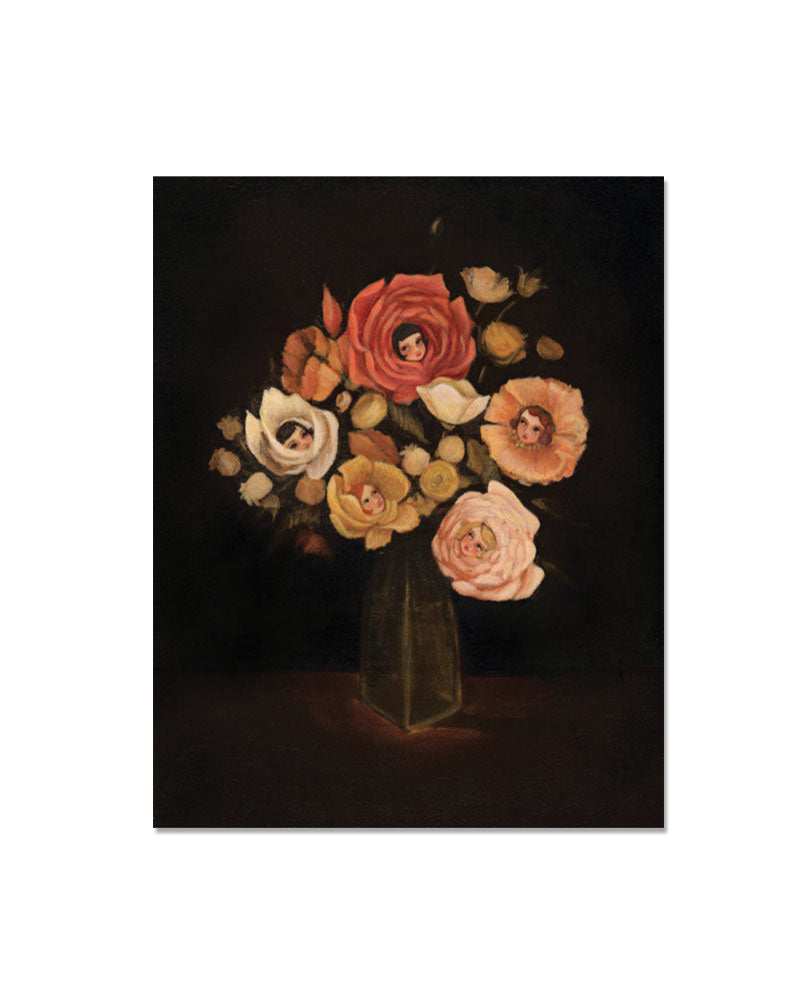 She says about this piece: “I was inspired by 16th century Dutch floral still lifes here. I thought it would be fun to pluck the talking blooms from the garden, and let them chat in this green glass bottle for a bit.”
